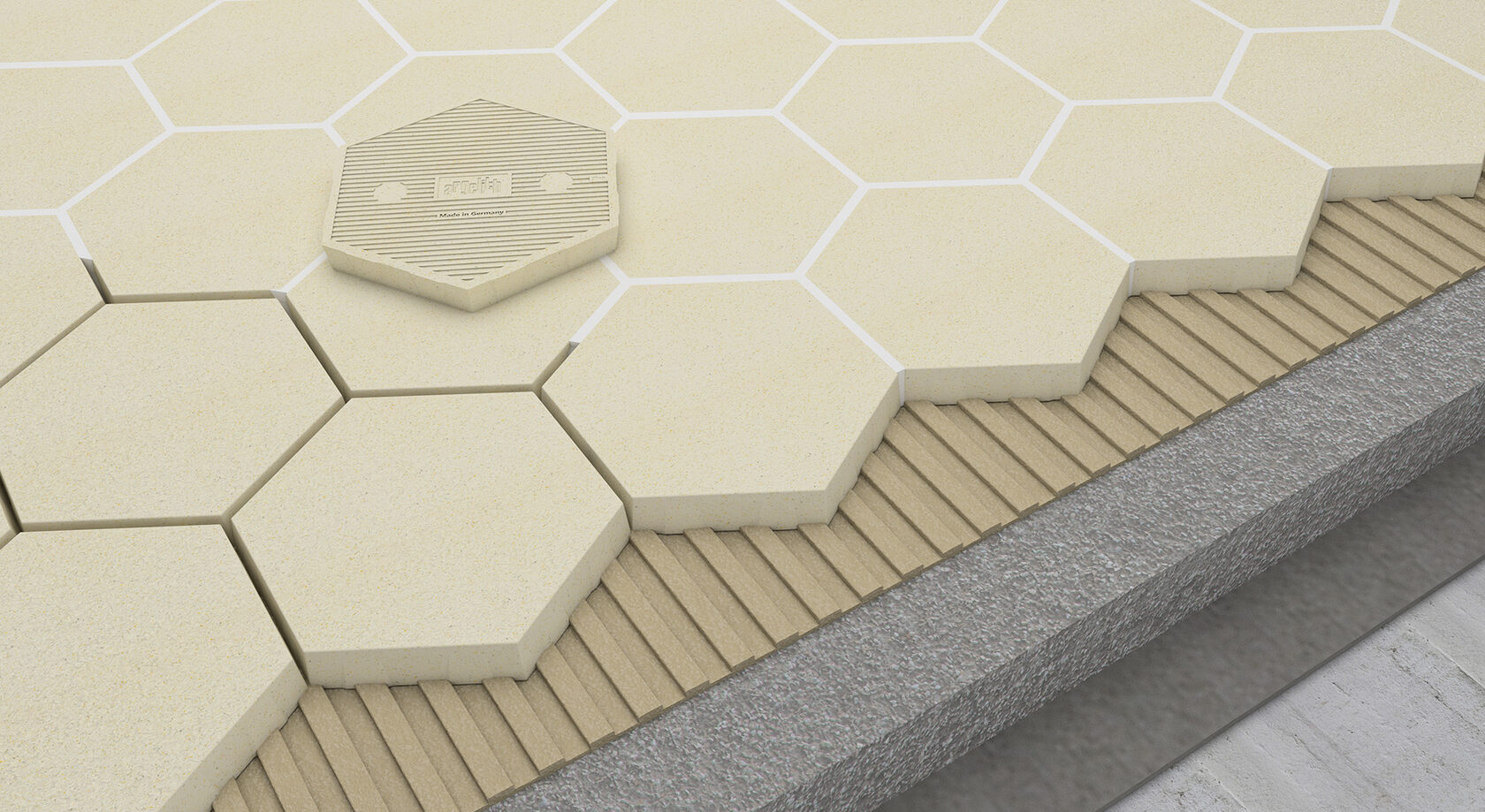 Падающие предметы, автомобили с пластиковыми колесами и бункеры весом в несколько тонн не представляют проблемы для плитки толщиной от 15 до 18 мм. Наша керамогранитная плитка премиум-класса Hexalith®, обладает лучшими свойствами керамогранита и имеет класс противоскольжения до R13 V10, предназначена для использования в гигиенических влажных зонах, особенно благодаря своей шестиугольной форме.